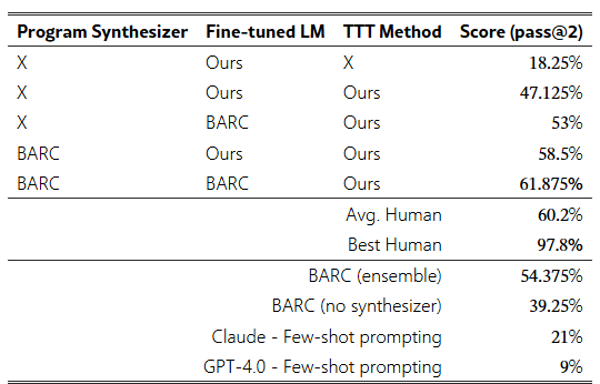 Table 1: ARC 검증 세트에서의 다양한 시스템 점수: 우리의 TTT 파이프라인은 기본 모델의 성능을 지속적으로 개선합니다. 미세 조정된 모델에 TTT를 적용했을 때 47.1%의 정확도를 달성했고, Li et al. (2024)의 BARC 모델에 적용했을 때는 53%를 기록하여 순수 LM 기반 접근법 중 최고 성능을 달성했습니다. 프로그램 생성 기반 모델과 우리의 방법을 앙상블한 결과, 61.875% 의 성능을 기록하여 평균 인간 성능(60.2%)에 근접했습니다.