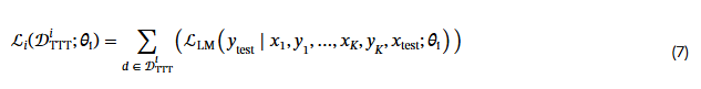 이전 연구들(e.g., Sun et al., 2020)에서, 𝒟_{TTT} 는 일반적으로 입력 𝐱 에 단독으로 비지도 목표(예: 마스크된 자동 인코딩)를 적용하여 생성되었습니다. 하지만 우리가 고려하는 맥락 내 학습 설정에서는 시연 쌍 ( x₁, y₁), ..., (x_K, y_K) 의 형태로 더 풍부한 맥락을 제공합니다. 여기에서 테스트 시점 튜닝을 적용하려면 먼저 테스트 입력 x 에 대해 입력별 데이터셋 𝒟_{TTT} 을 매핑하는 초기 언어 모델 LM 을 구성하고, 데이터셋에 대한 손실 함수 ℒ 를 최적화하도록 LM을 미세 조정하며, 최종적으로 업데이트된 모델에서 샘플링하여 최종 예측을 얻습니다. 이 논문에서는 이 파이프라인의 각 구성 요소를 특성화하며 다음과 같은 내용을 설명합니다: