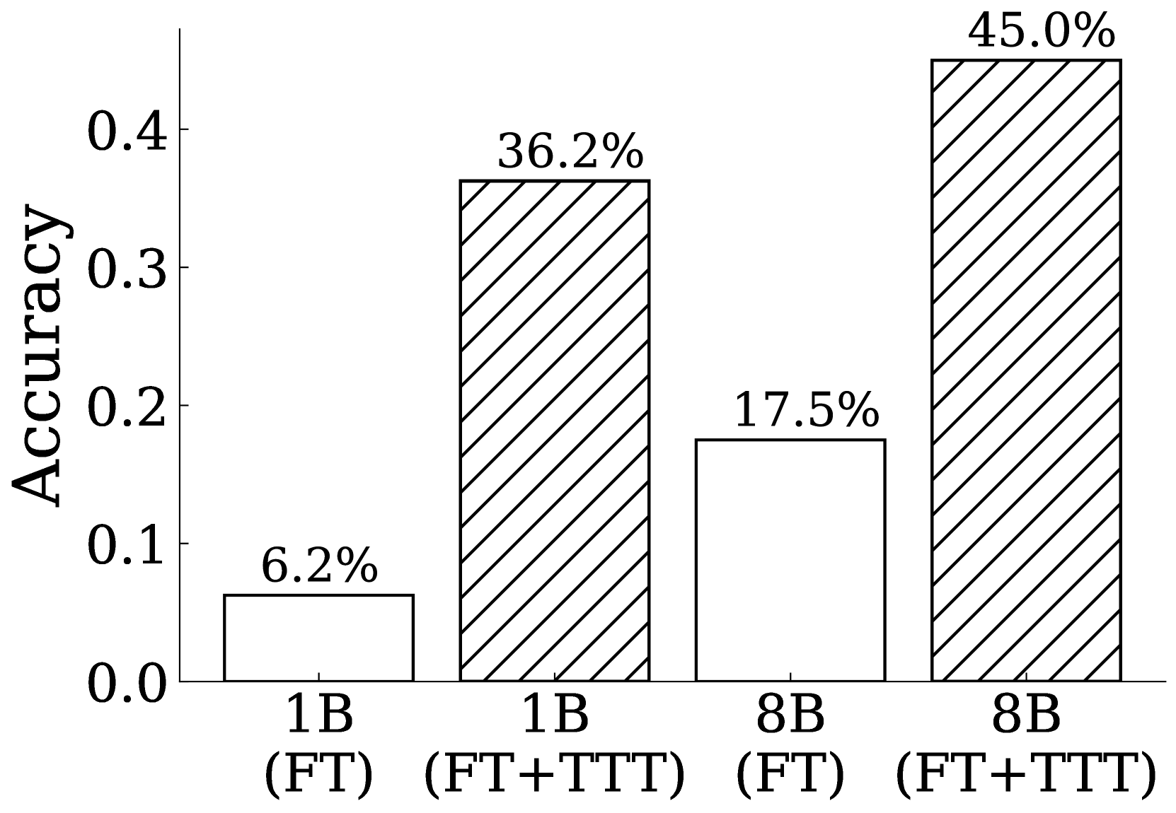 테스트 시점 훈련의 영향 우리는 기본 미세 조정된 모델(섹션 5에서 LM 데이터 없이 미세 조정된 80억 모델)에 우리의 TTT와 추론 절차(섹션 3 및 4에 설명)를 적용했습니다. TTT는 정확도를 39.25% 에서 47.125% 로 향상시켜 기존의 종단간 신경망 모델 결과를 초과했습니다.