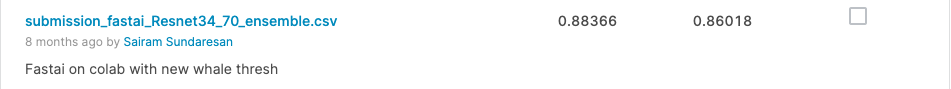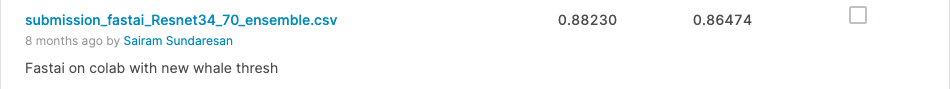 아직 언급하지 않은 한 가지는 'new_whale' 클래스를 어떻게 예측했는가 하는 것입니다. 이제 이를 설명하겠습니다. 모든 'new_whale' 클래스의 인스턴스를 제거했기 때문에, 모델은 추론 시 이 클래스를 예측하지 않았습니다. 이를 다시 예측에 포함시키기 위해, 예측의 softmax 점수를 가이드로 사용했습니다. 상위 5개의 예측과 그 softmax 점수를 고려하여, 이 점수들 중 어느 하나가 임계값보다 낮은지 확인했습니다. 만약 그렇다면, 이 임계값보다 낮은 점수 바로 전에 'new_whale' 클래스를 예측으로 추가했습니다. 이 전략은 토론 포럼에서 제안된 것이지 제가 직접 고안한 것이 아님을 알려드립니다. 최적의 임계값을 찾기 위해 각 폴드에 대해 그리드 검색을 수행했고, 이 값을 최종 예측에 사용했습니다. 이 두 주가 끝날 때쯤, 제 최종 점수는 20 에포크 학습 후 384 x 384 해상도에서 0.8이었습니다.