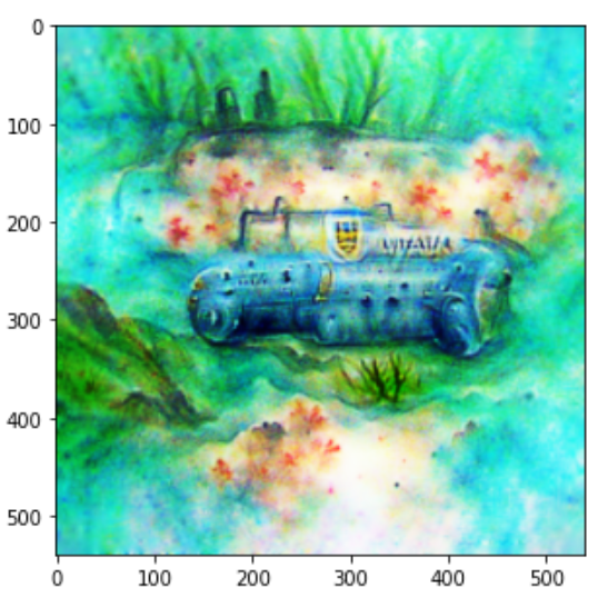 CLIP 프롬프트 '수중 잠수함의 수채화 그림'과 일치하도록 imstack의 파라미터를 최적화하여 생성한 이미지