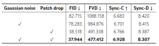 다양한 패치 드롭 크기. 표 4는 성능 지표에 미치는 다양한 패치 드롭 크기의 효과를 보여줍니다. 패치 크기가 0이면 패치 드롭이 적용되지 않음을 의미하며, 우리의 구현에서는 패치 크기 1을 사용합니다. 결과는 FID와 FVD 개선으로 시각적 결과가 향상되고, 모션 동기화 능력도 어느 정도 개선됨을 보여줍니다.