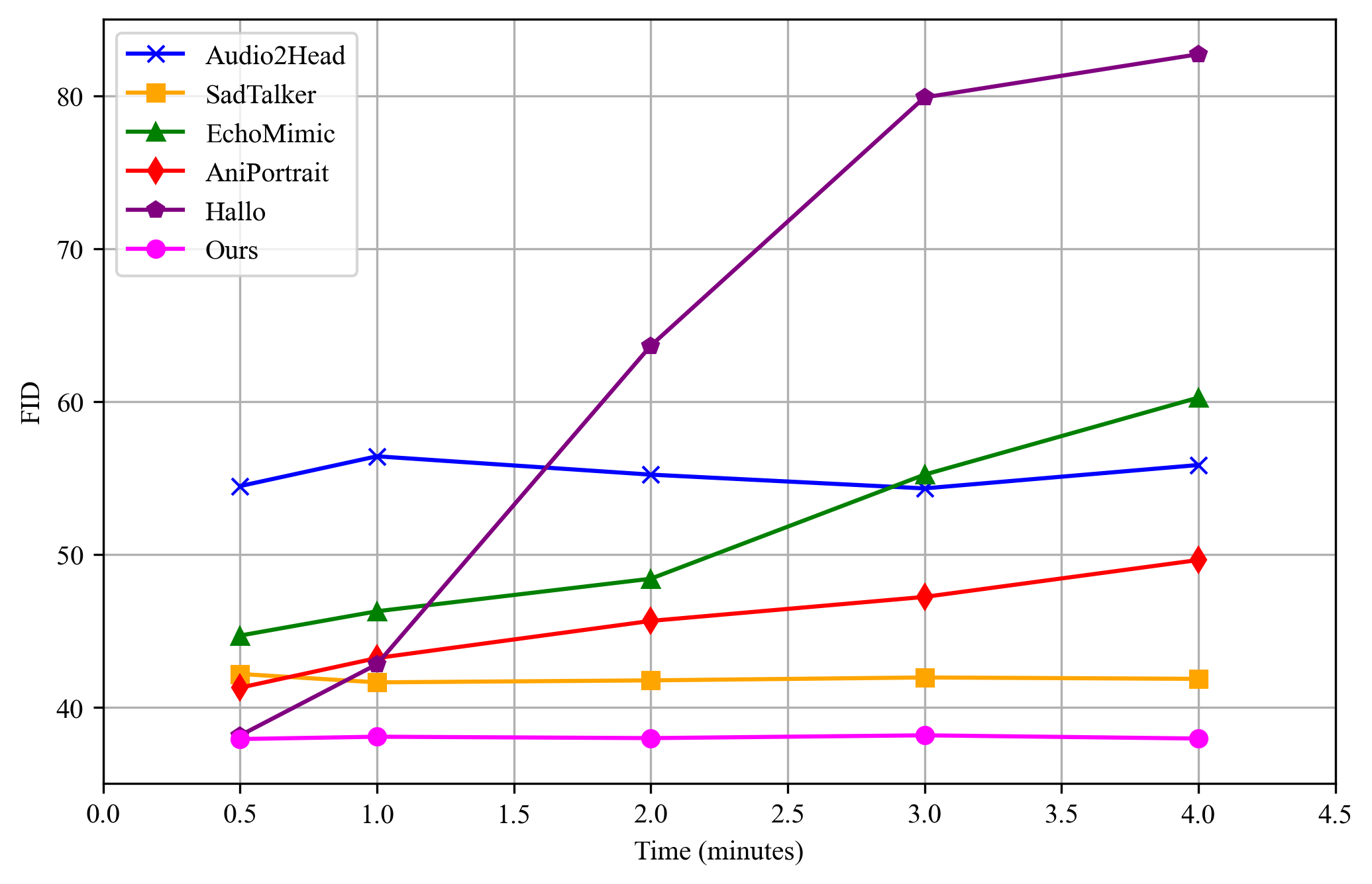 그림 5: HDTF 데이터셋에서 기존 초상화 이미지 애니메이션 접근법과의 정량적 비교. 우리의 평가에서는 4분 길이의 생성된 비디오를 대상으로 하며, 이후의 정량적 실험에서도 일관된 설정을 유지합니다.