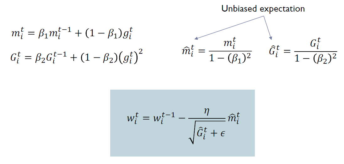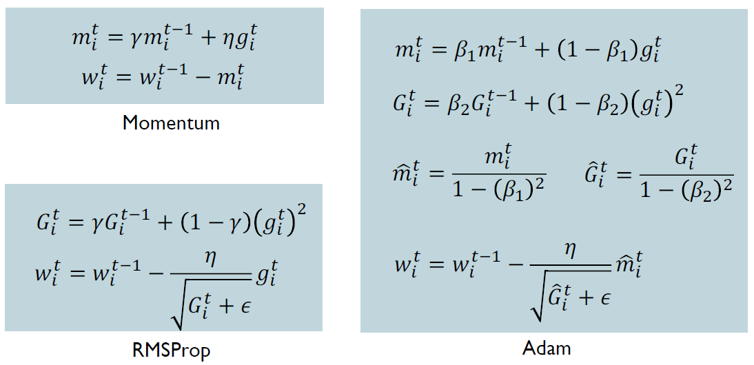 종류는 Adagrad, RMSProp, Adam, 등이 있으며 일반적으로 Adam과 RMSProp이 가장 많이 쓰인다.