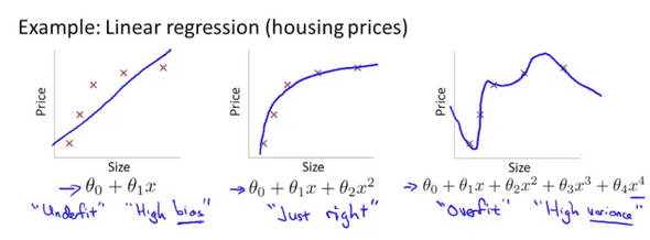 제일 왼쪽의 형태는 데이터의 증감을 잘표현했지만 너무 큰 error를 발생시킨다. 이렇게 모델이 너무 단순해서 데이터의 복잡성을 포착할 수 없는 모델을 Underfit이라고 말하며 높은 편향(Bias)를 가지고 있다.
