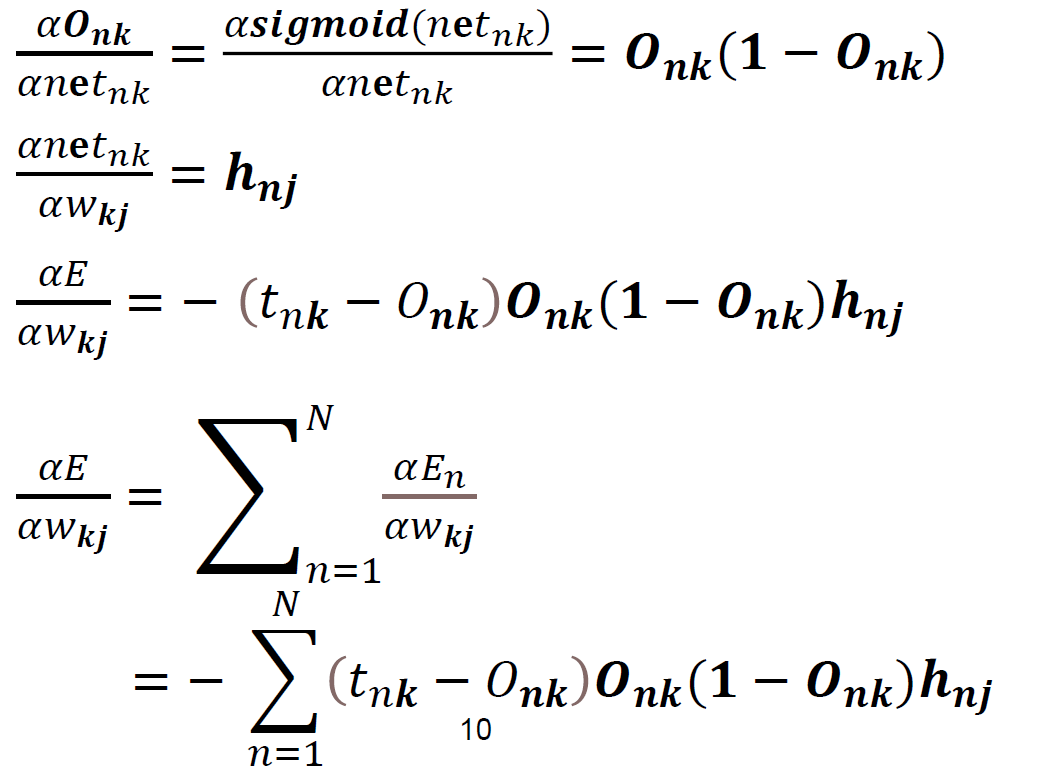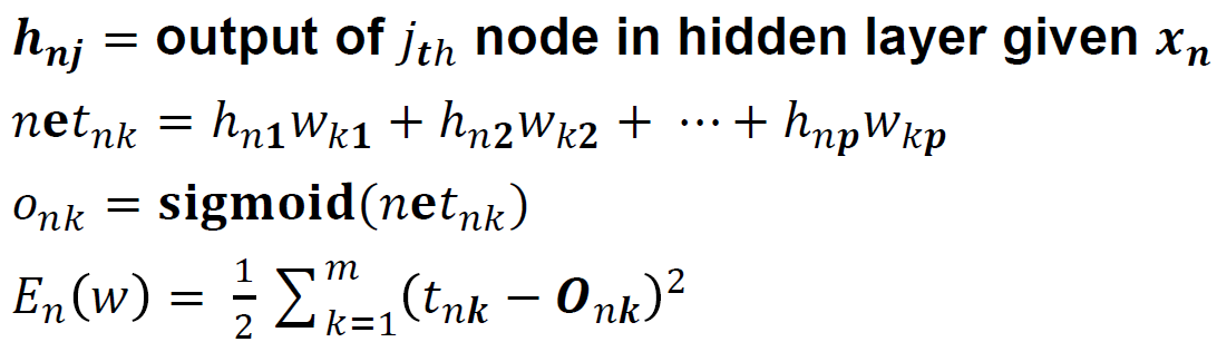 계산은 Output과 Hidden Layer의 weight을 사용하는 계산을 바탕으로 진행할 것이며 그렇게 되면 수식은 다음과 같이 정의할 것이다. (초기 모델은 Sigmoid function을 사용한다고 앞에서 설명하였다.)