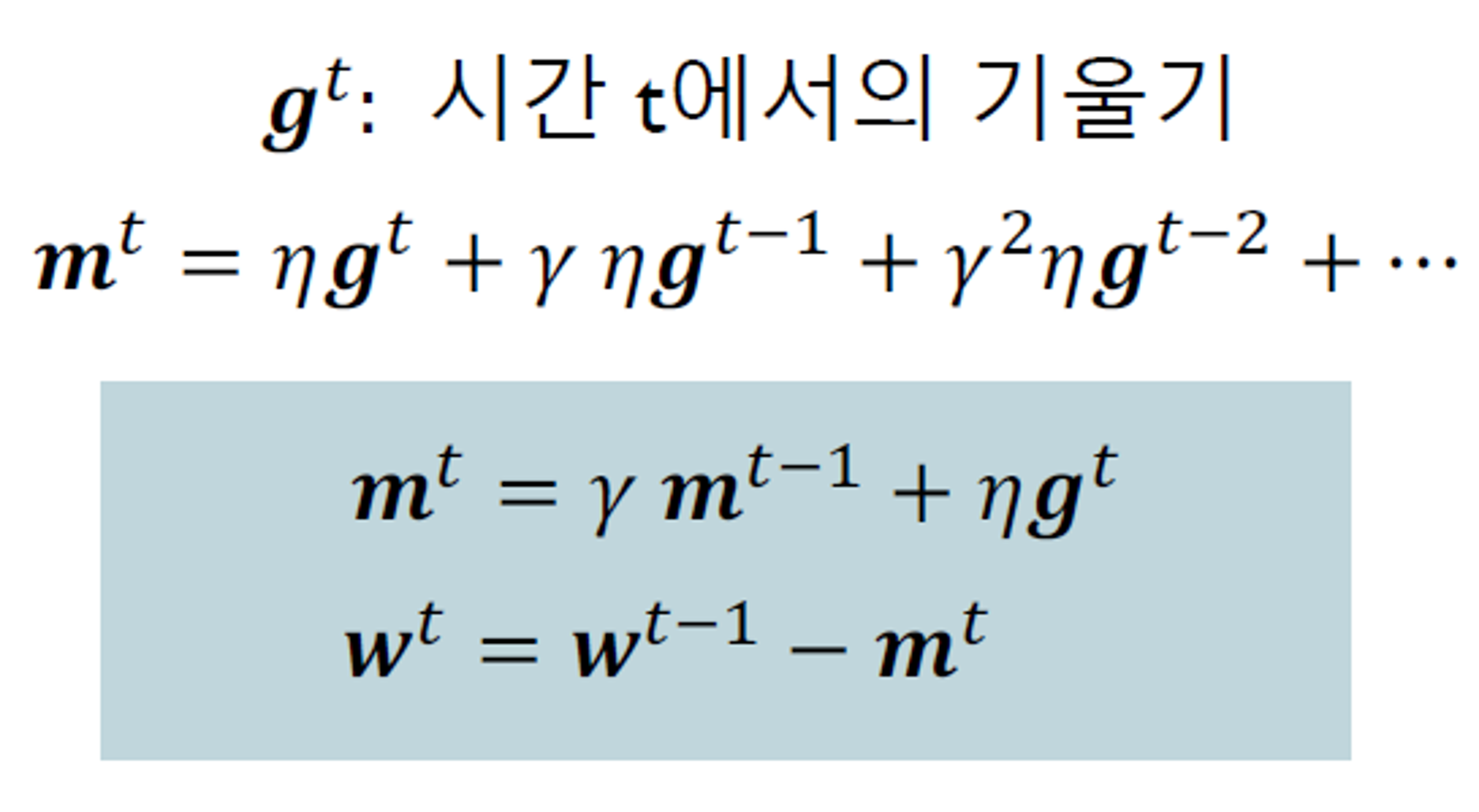 모멘텀은 과거 그래디언트의 지수 평균으로 표현된다.