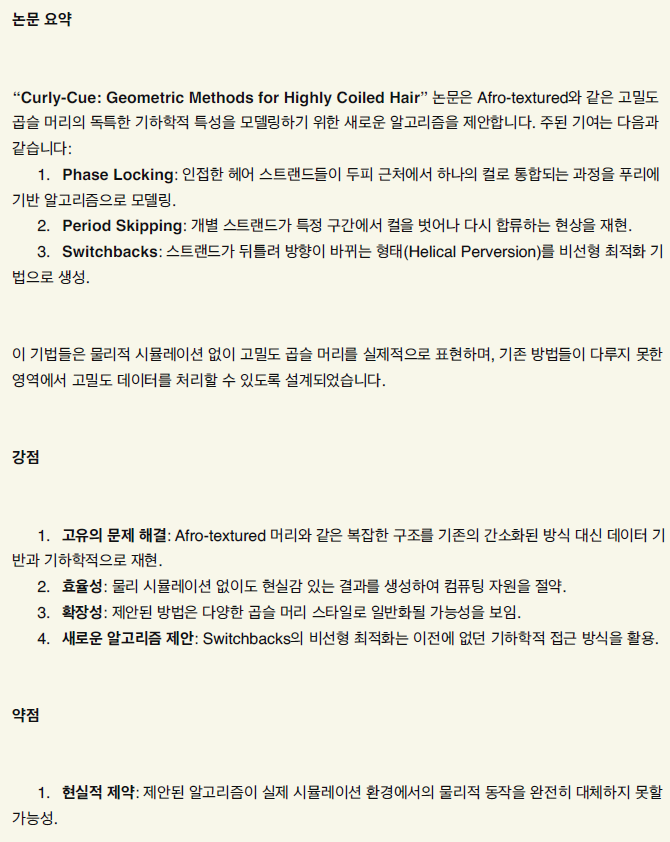 개인적 생각: 이 논문은 영화나 애니메이션과 같은 시각적 효과를 중시하는 분야에서 매우 유용할 것으로 보이지만, 다른 머리 스타일과 응용 가능성을 더 확장한다면 훨씬 큰 가치를 가질 것 같습니다.