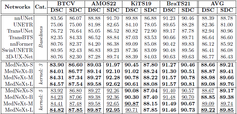 MedNeXt는 5-폴드 교차검증(5-fold CV) 점수와 공식 테스트셋 리더보드라는 두 가지 측면에서 기존 베이스라인을 성공적으로 뛰어넘는다. 표 2에 제시된 5-폴드 CV 결과를 보면, 3×3×3커널을 사용하는 MedNeXt는 깊이(depth)와 너비(width)의 스케일링을 통해, 추가 학습 데이터 없이도 4개 전 과업(기관/장기 및 종양)에 걸쳐 모든 베이스라인 대비 최신 수준(state-of-the-art)의 분할 성능을 달성한다.