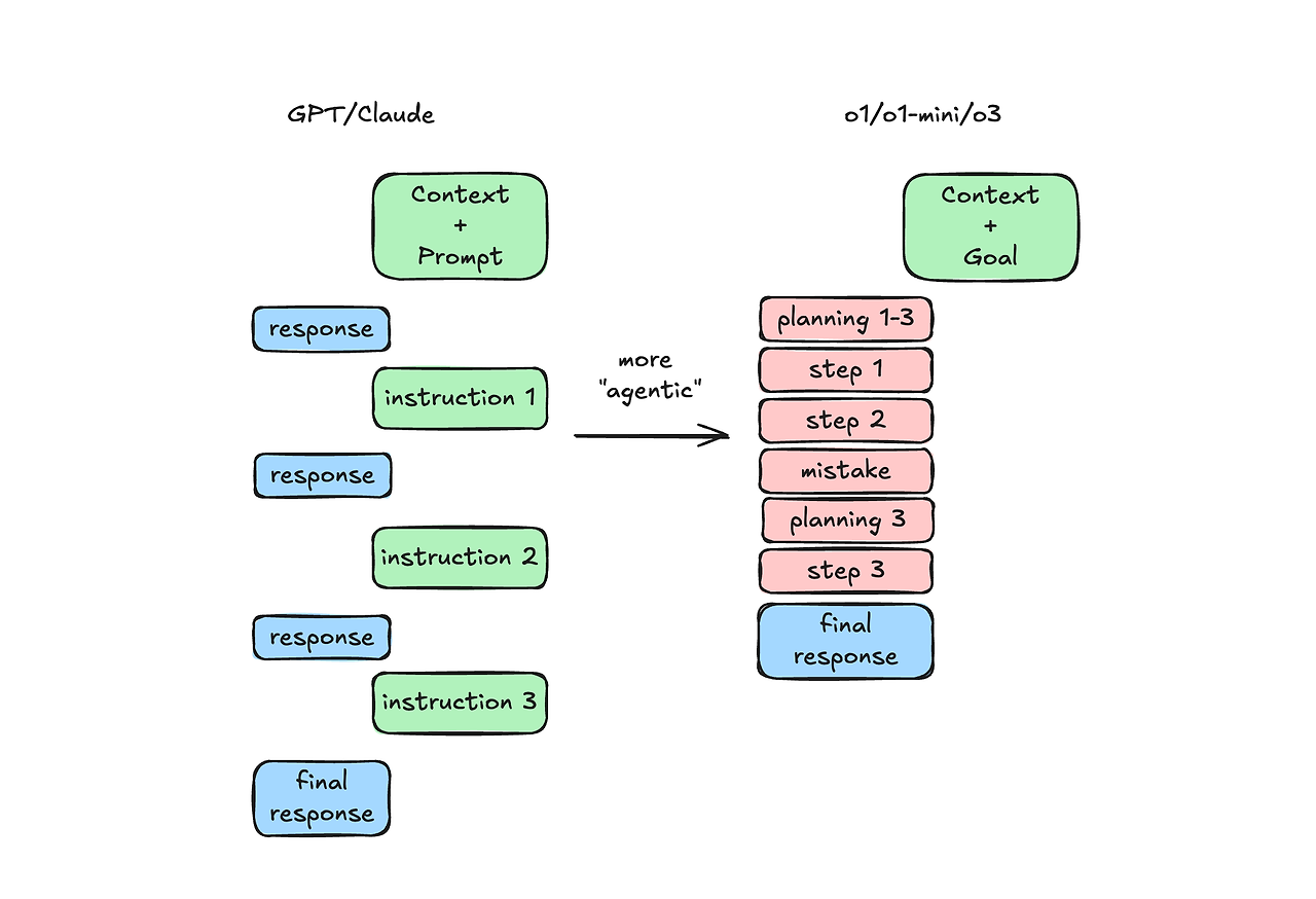 하지만 o1은 사용자가 대충 질문을 던지면 그대로 받아들이고, 맥락 정보를 적극적으로 캐내려 하지 않는다. 결국 사용자가 직접, 가능한 한 많은 맥락을 o1에게 ‘밀어넣어야’ 한다.