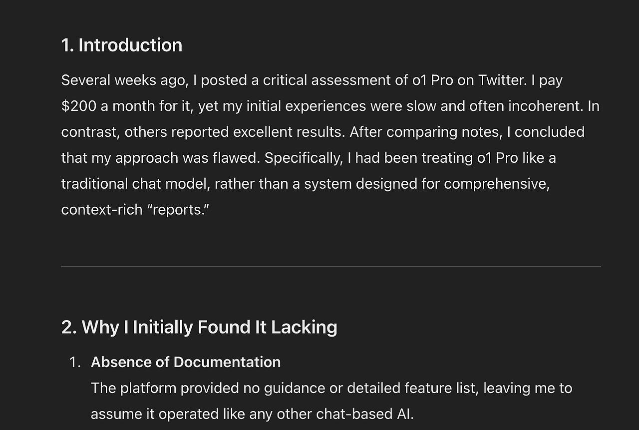 하지만 o1을 제대로 활용하는 법은 정반대라고 느꼈다. 나는 모델에게 어떻게 할지는 지시하지 않고, 무엇을 할지만 말해준다. 그러고 나면 o1이 스스로 계획을 세우고 단계를 해결한다. 이것이야말로 자율적 추론(autonomous reasoning)의 목적이며, 사람이 직접 중간중간 검토하거나 지시하는 것보다 훨씬 빠를 수도 있다.