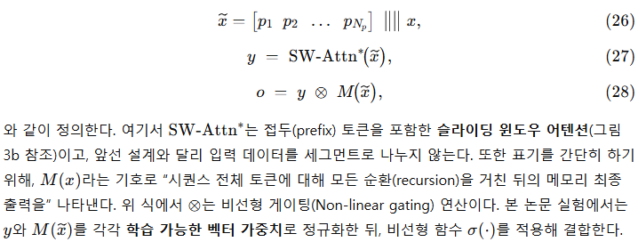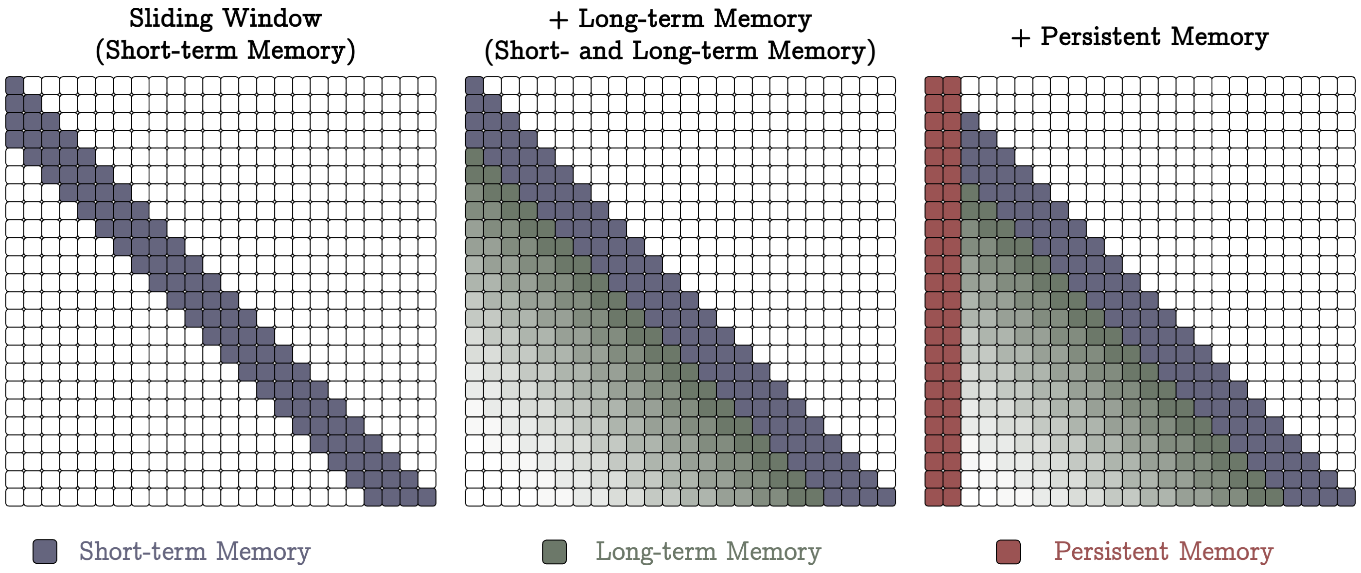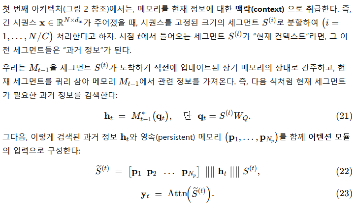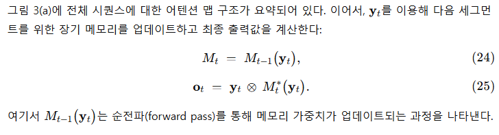 - 장기 메모리(Long-term Memory): 이 브랜치는 우리가 제안하는 신경 기반 장기 메모리 모듈로서, 오래전 정보를 저장·기억하는 기능을 담당한다.