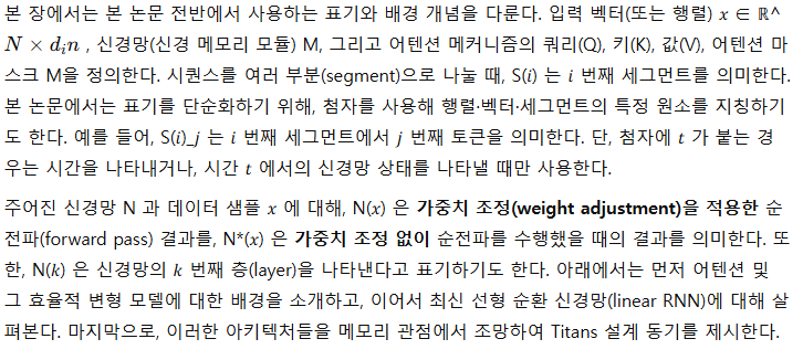 신경심리학(neuropsychology) 문헌에서 제시하는 일반적인 기억(memory)과 학습(learning)의 정의(Okano, Hirano, and Balaban 2000)에서 영감을 받아, 대부분의 기존 아키텍처들은 메모리를 ‘입력에 의해 야기되는 신경 업데이트(neural update)’로 간주하며, 주어진 목적(objective)에 부합하는 ‘효과적이고 유용한 메모리 획득 과정’을 학습이라고 정의한다. 이런 관점에서, 순환 신경망(Recurrent Neural Networks, RNNs) (Williams and Zipser 1989)은 벡터 형태의 메모리 모듈 𝑀(은닉 상태라고도 함)을 갖는 모델로 볼 수 있으며, 이 모델은 크게 두 단계를 수행한다. 시간 𝑡에서 새 입력 𝑥ₜ가 주어졌을 때, (1) 𝑓(𝑀ₜ₋₁, 𝑥ₜ) 함수를 통해 메모리를 업데이트(압축 포함)하고, (2) 𝑔(𝑀ₜ, 𝑥ₜ) 함수를 통해 해당 입력에 대응하는 메모리를 검색한다(자세한 내용은 §2.1 참조).