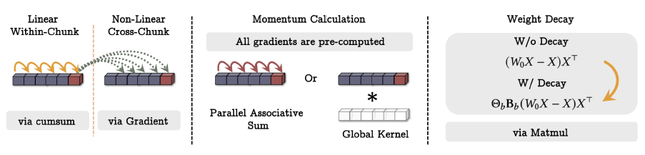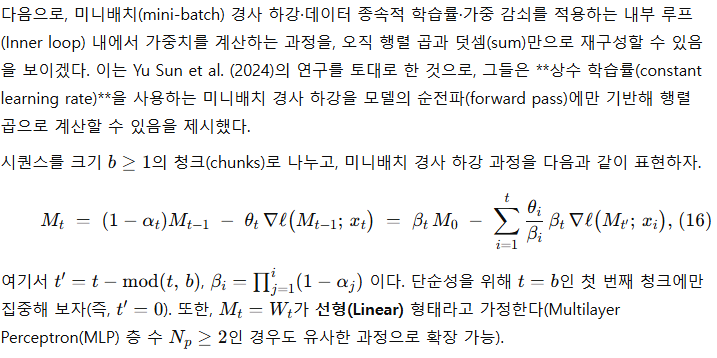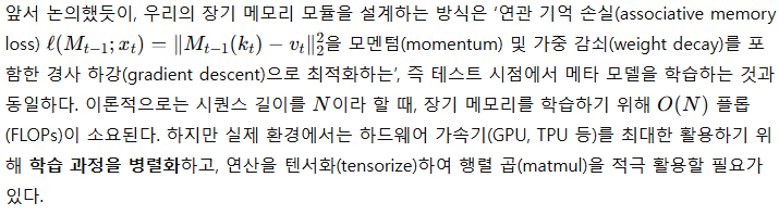 마지막으로, 미니배치 경사 하강을 텐서 연산으로 확장(tensorizing)하여 보다 많은 행렬 곱(matmul) 연산을 활용하는 기존 기법(Yu Sun et al. 2024)에 기반해, 우리는 병렬 처리가 가능하면서도 빠른 딥 신경 장기 메모리 학습 알고리즘을 제시한다. - Titans 아키텍처(§4)