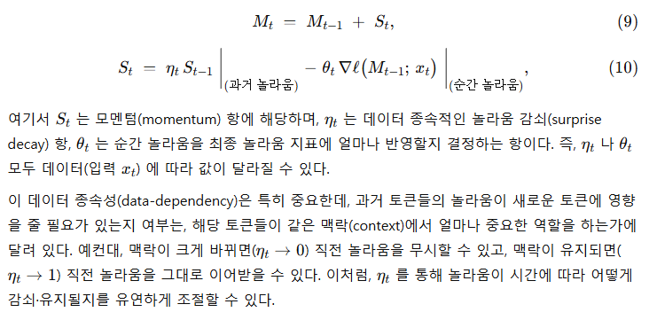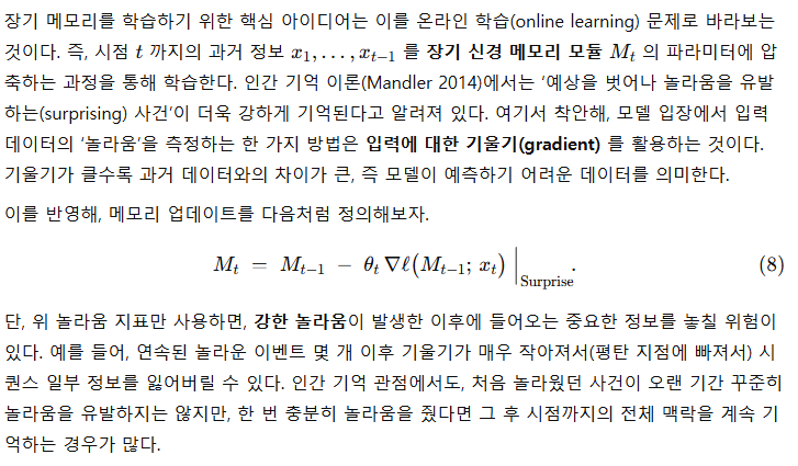 인간 장기 기억 시스템(Mandler 2014)에서 영감을 받아, 놀라움(surprise)을 유발하는(즉, 예상을 벗어나는) 이벤트가 더욱 잘 기억되도록 이 메모리 모듈을 설계했다. 이를 위해, 우리는 연관 기억 손실(associative memory loss)에 대해 입력에 대한 신경망의 기울기(gradient)를 측정함으로써 입력의 ‘놀라움’을 계산한다(자세한 내용은 §3.1 참조).
