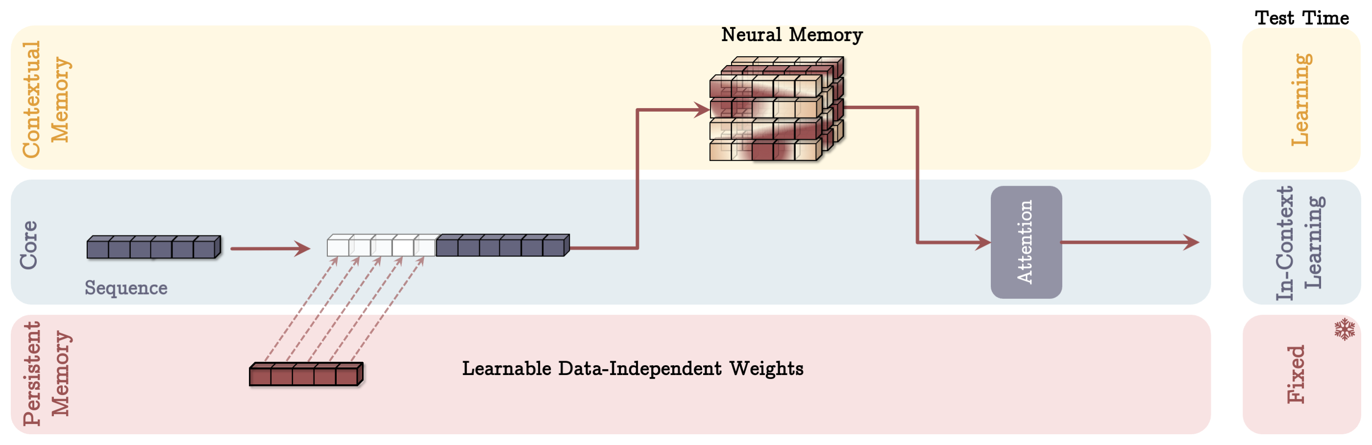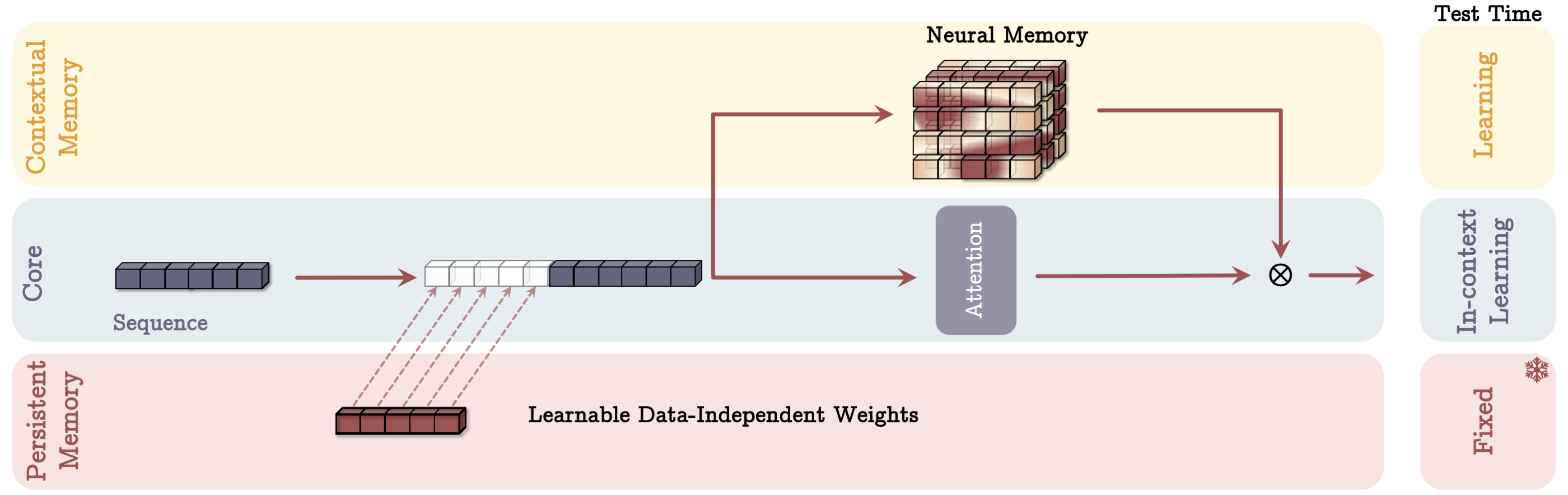 이 아키텍처에는 (1) 코어(core), (2) 문맥적(장기) 메모리, (3) 영속(persistent) 메모리의 세 가지 브랜치가 있다. 코어 브랜치는 입력 시퀀스에 해당하는 토큰들과 그에 대응하는 장기·영속 메모리를 연결(concatenate)한다. 이후 어텐션이 시퀀스에 적용되어, 어떤 정보를 장기 메모리에 저장할지 결정한다. 테스트 시점에는 컨텍스트 메모리에 해당하는 파라미터는 계속 학습되고, 코어 브랜치의 파라미터는 인-컨텍스트 학습(in-context learning)을 담당하며, 영속 메모리 파라미터는 태스크 관련 지식을 저장하는 역할을 하므로 고정된다.