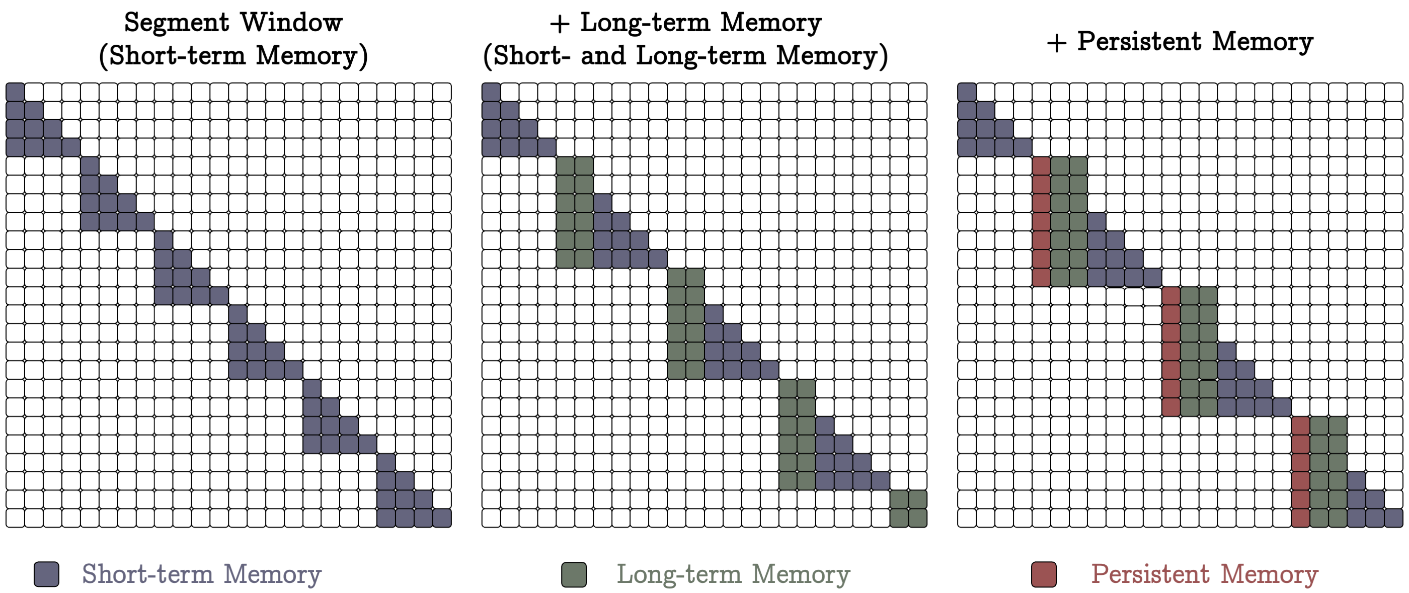 여기서 남아 있는 중요한 질문은 다음과 같다. “설계된 신경 메모리를 딥러닝 아키텍처에 어떻게 효과적이고 효율적으로 결합할 수 있을까?” 앞서 논의했듯이, 메모리 관점에서 트랜스포머의 K, V 행렬 쌍은 연관 기억 블록(associative memory block)으로 해석할 수 있다. 트랜스포머가 토큰 간 의존 관계를 매우 정확하게 모델링하는 대신 문맥 윈도우 크기가 제한된다는 점을 감안하면, 이를 ‘단기 메모리(short-term memory) 모듈’ 로 볼 수 있다.