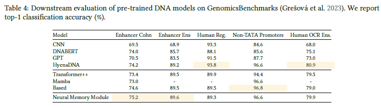 표 4: GenomicsBenchmarks (Grešová et al. 2023)에서 사전 학습된 DNA 모델들의 다운스트림 결과. Top-1 분류 정확도(%)를 보고.