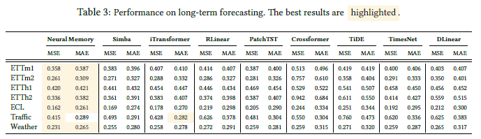 ETT, ECL, Traffic, Weather (H. Zhou et al. 2021) 등 대표적인 시계열 예측 벤치마크 데이터셋에서의 결과를 표 3에 요약했다. 그 결과, 신경 메모리 모듈은 Mamba 기반, 선형(Linear) 기반, 트랜스포머(Transformer) 기반 아키텍처를 모두 능가하는 성능을 보였다.