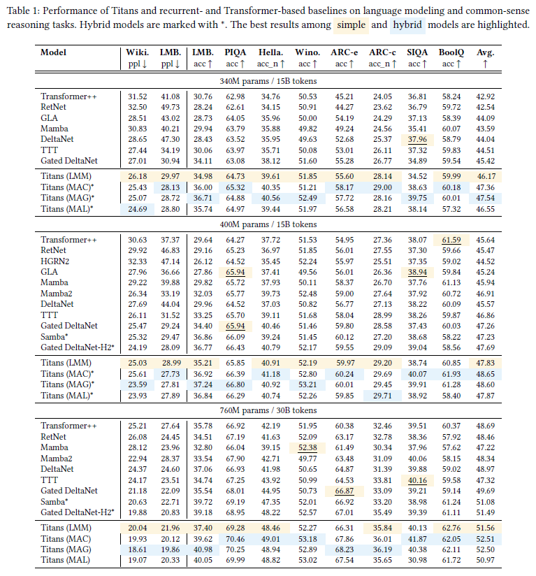 - 소형 모델(Titans과 파라미터 수가 거의 비슷)