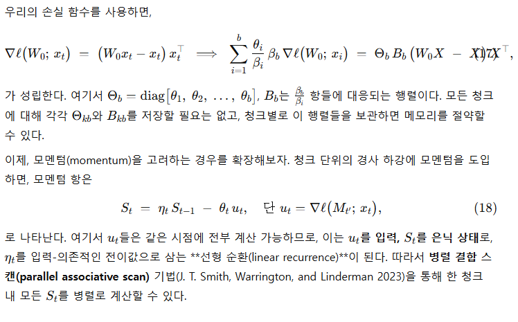 이후 본 절에서 보이겠지만, 이런 가중 감쇠(weight decay) 형태의 망각 메커니즘은 최신 순환 신경망(RNN)의 게이트 구조(Dao and Gu 2024; Orvieto et al. 2023)와 밀접한 관련이 있다.