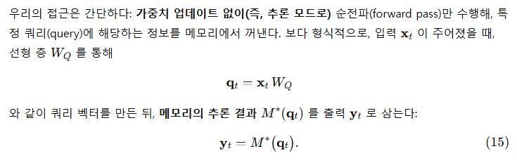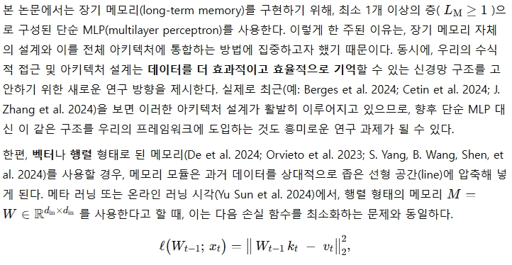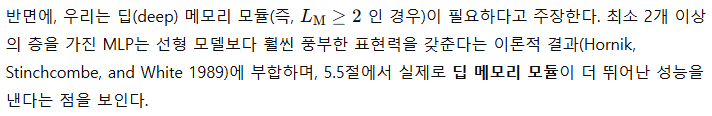 논문에서 주장하는 핵심은, 단순한 선형 변환(행렬)보다는 여러 층을 가진 신경망(MLP)을 사용하면 더 효과적으로 정보를 기억하고 처리할 수 있다는 것입니다. 실제 실험 결과(5.5절)에서도 이러한 딥 메모리 구조가 더 좋은 성능을 보였다고 합니다.