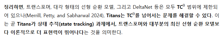 - 논문 후반부에 “Titans는 Transformer나 DeltaNet보다 이론적으로 더 표현력이 높다(TC0를 넘어선다)”는 식의 문장이 있는데, 이 부분이 일종의 이론적 과대포장처럼 보이기도 합니다.