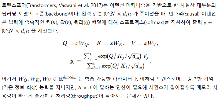 트랜스포머(Transformers, Vaswani et al. 2017)는 순수 어텐션(attention) 기반 아키텍처로, 문맥 내 학습(in-context learning) 능력과 대규모 확장 학습(Kaplan et al. 2020) 덕분에 시퀀스 모델링 분야에서 사실상의 최신(state-of-the-art) 모델로 자리매김했다. 트랜스포머의 핵심 구성 요소인 어텐션 모듈은 연관 기억(associative memory) 블록처럼 작동하여(Bietti et al. 2024), 쿼리(검색 신호)와 키(문맥)의 쌍wise 유사도를 계산함으로써 키-값(key-value) 연관 관계를 저장하고 검색한다. 이렇게 설계된 트랜스포머의 출력은 현재 문맥 윈도우 내 토큰들의 직접적인 의존 관계에 전적으로 좌우된다. 그러나 이러한 높은 의존 관계 모델링 정확도는 문맥 길이에 대해 시간과 메모리 사용량 모두 이차적(quadratic)으로 증가하는 복잡도를 야기한다. 복잡한 실제 과제—예컨대 언어 모델링(N. F. Liu et al. 2024), 비디오 이해(C.-Y. Wu et al. 2019), 장기 시계열 예측(H. Zhou et al. 2021) 등—에서는 문맥 윈도우가 극도로 커질 수 있으므로, 이러한 다운스트림 과제에서 트랜스포머를 활용하기가 어려워질 수 있다.