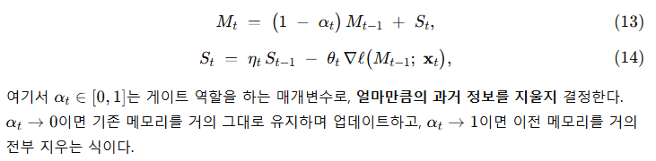 이를 위해, 우리는 적응형(adaptive) 망각 기법을 도입한다. 이는 필요한 경우 메모리를 지우고, 그렇지 않다면 유지함으로써 메모리를 더 효과적으로 관리할 수 있도록 해준다. 구체적으로, 다음과 같이 업데이트 규칙을 수정한다.