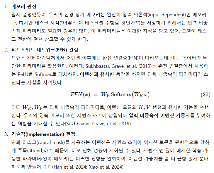 우리의 장기 메모리는 ‘문맥적 메모리(contextual memory)’로 볼 수 있는데, 이는 모든 파라미터가 입력에 따라 동적으로 변화한다는 의미다. 하지만 효과적인 메모리 시스템은 입력과 무관하게(input-independent) 태스크 지식을 저장할 수 있는 파라미터도 필요하다. 예컨대, 태스크를 숙달하기 위해서는 "태스크를 어떻게 수행해야 하는지"라는 지식을 기억해야 하는데, 이러한 정보를 저장·관리하는 파라미터가 별도로 필요한 것이다.