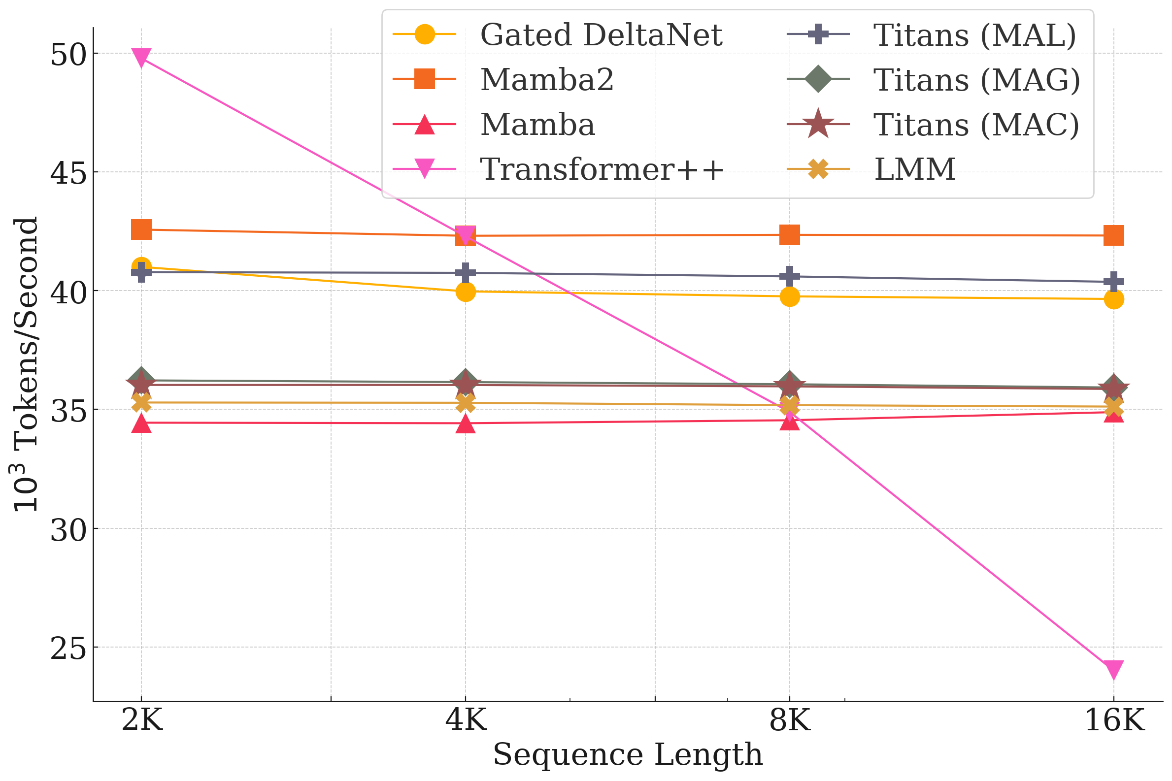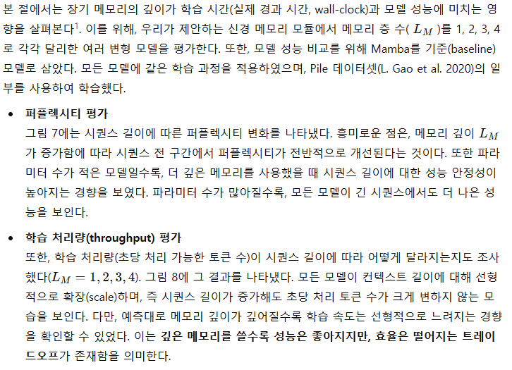 우리의 신경 메모리 모듈이 Mamba2, Gated DeltaNet보다 소폭 느린 이유는 크게 두 가지다:- 더 깊은 메모리(deep memory)로 인한 표현력 높은 전이(transition) 과정(메모리 업데이트)의 존재