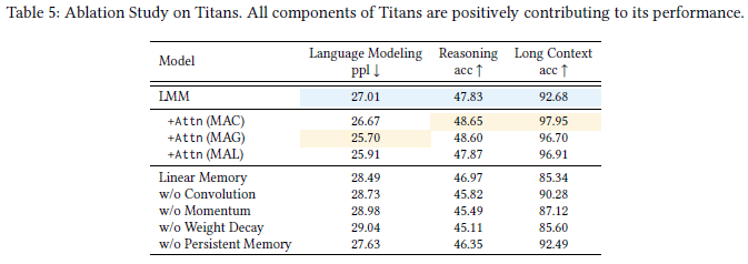 표 5: Titans에 대한 소아블레이션(Ablation) 결과. 각 구성 요소가 성능에 모두 긍정적인 영향을 미침.