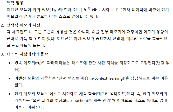 - 논문 전반에서, “테스트 시점에도 메모리가 업데이트된다”는 게 핵심적인 세일즈 포인트입니다.