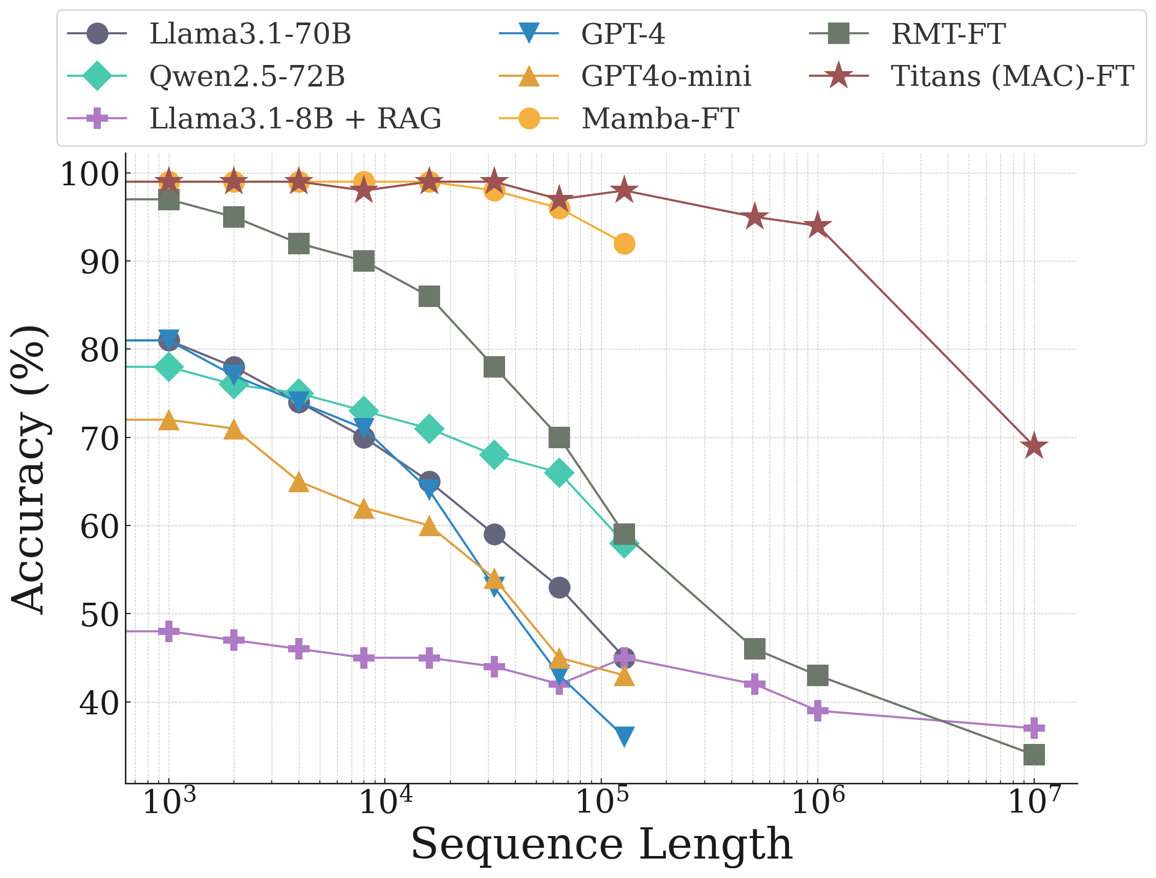 흥미로운 점은, Llama3.1-8B에 RAG를 결합한 모델 역시 약 70배나 많은 파라미터를 쓰면서도 Titans보다 성능이 낮게 나타났다는 사실이다.