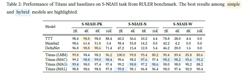 본 섹션에서는 **RULER 벤치마크(Hsieh et al. 2024)**의 단일 NIAH(S-NIAH) 태스크를 활용해, 길이 2K, 4K, 8K, 16K의 시퀀스에서 Titans와 베이스라인 모델들을 평가했다(결과는 표 2 참조).