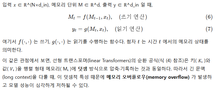 선형 모델에서 필요할 때 메모리를 지우도록 해주는 적응형(데이터 종속형) 망각 게이트를 설계하는 연구들이 진행되어 왔다. 예컨대 GLA (S. Yang, B. Wang, Shen, et al. 2024), LRU (Orvieto et al. 2023), Griffin (De et al. 2024), xLSTM (Beck et al. 2024), Mamba2 (Dao and Gu 2024) 등이며, 이 중 Mamba2는 기존 상태공간 모델(state space models)의 이산화(discretized) 버전과 연결된다(Gu and Dao 2024). - 쓰기 연산 개선: