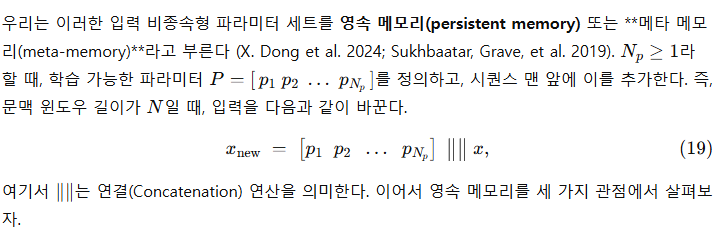 - 영속 메모리(Persistent Memory): 이는 태스크와 관련된 사전 학습(또는 지식)을 담고 있는, 데이터와는 독립적인 매개변수들의 집합이다.