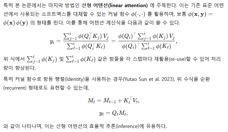 긴 시퀀스에서 소프트맥스 어텐션의 메모리 사용량과 처리량 문제를 완화하기 위해, 다양한 연구들이 I/O 처리에 대한 고려(Dao 2024; Dao, D. Fu, et al. 2022), 어텐션 행렬 희소화(sparsifying) (B. Chen et al. 2021; Choromanski et al. 2021; Dai et al. 2019), 소프트맥스 근사(Arora et al. 2024), 커널 기반(선형) 어텐션(Aksenov et al. 2024; Kacham, Mirrokni, and P. Zhong 2024; Schlag, Irie, and Jürgen Schmidhuber 2021; S. Yang, B. Wang, Shen, et al. 2024) 등 다양한 접근을 시도해 왔다.
