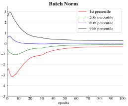 Figure 6: VGG-16의 conv5_3 출력(정규화와 ReLU 이전)에 대한 특징 분포가 학습 도중 어떻게 변화하는지 {1, 20, 80, 99} 분위(percentile)를 이용해 시각화했다. 표 오른쪽에는 ImageNet 검증 에러율(%)이 제시되어 있으며, 모델은 GPU당 32개 이미지를 사용해 학습했다.