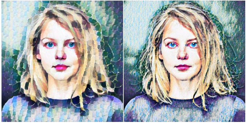 그림 6: 그림 4에 제시된 콘텐츠 이미지를 Delaunay 스타일로 서로 다른 해상도(512(왼쪽), 1080(오른쪽))에서 처리한 예시.