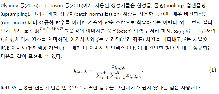 단순한 관찰로, 스타일화 결과는 일반적으로 콘텐츠 이미지의 대비(contrast)에 의존해서는 안 된다는 점을 들 수 있다(그림 2 참고). 사실 스타일 손실(style loss)은 스타일 이미지의 대비를 유사하게 반영하는 방식으로 콘텐츠 이미지에 스타일 요소들을 전이하도록 설계되었다. 따라서 생성기 네트워크는 콘텐츠 이미지의 대비 정보를 제거(discard)할 수 있어야 한다. 문제는 이러한 대비 정규화(contrast normalization)를 표준적인 CNN 구성 요소들을 단순히 조합함으로써 효율적으로 구현할 수 있느냐, 아니면 아키텍처 차원에서 직접 구현하는 것이 가장 좋은 방법이냐 하는 것이다.