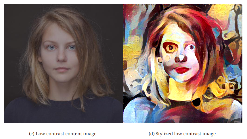 그림 2: 스타일화된 이미지의 대비(contrast)는 주로 스타일 이미지의 대비에 의해 결정되며, 콘텐츠 이미지의 대비에는 거의 영향을 받지 않는다. 스타일화는 Gatys 등(2016)의 방법을 사용하였다.