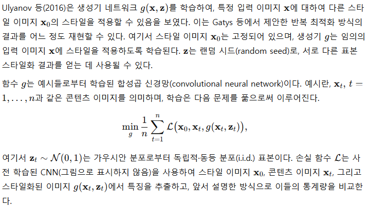 그러나 Gatys 등의 방식은 매우 우수한 시각적 결과물을 내지만, 계산 효율 면에서 비효율적이라는 한계가 있다. 스타일화된 이미지는 목표 통계량과 일치할 때까지 반복 최적화(iterative optimization)를 수행해야 하며, 512×512 해상도 이미지를 스타일화하는 데 일반적으로 수 분이 소요된다. 이러한 문제를 해결하기 위해, Ulyanov 등(2016)과 Johnson 등(2016)은 이를 단일 추론 단계(single pass)만으로 스타일화 이미지를 생성할 수 있는 피드포워드(feed-forward) 방식의 생성기(generator) 신경망을 학습하는 방법을 제안하였다. 이 두 연구는 주로 생성기 아키텍처의 세부 사항에서 차이가 있으며, 유사한 품질의 결과를 보인다. 하지만 여전히 Gatys 등의 반복 최적화 방식만큼 뛰어난 품질을 달성하지는 못했다.