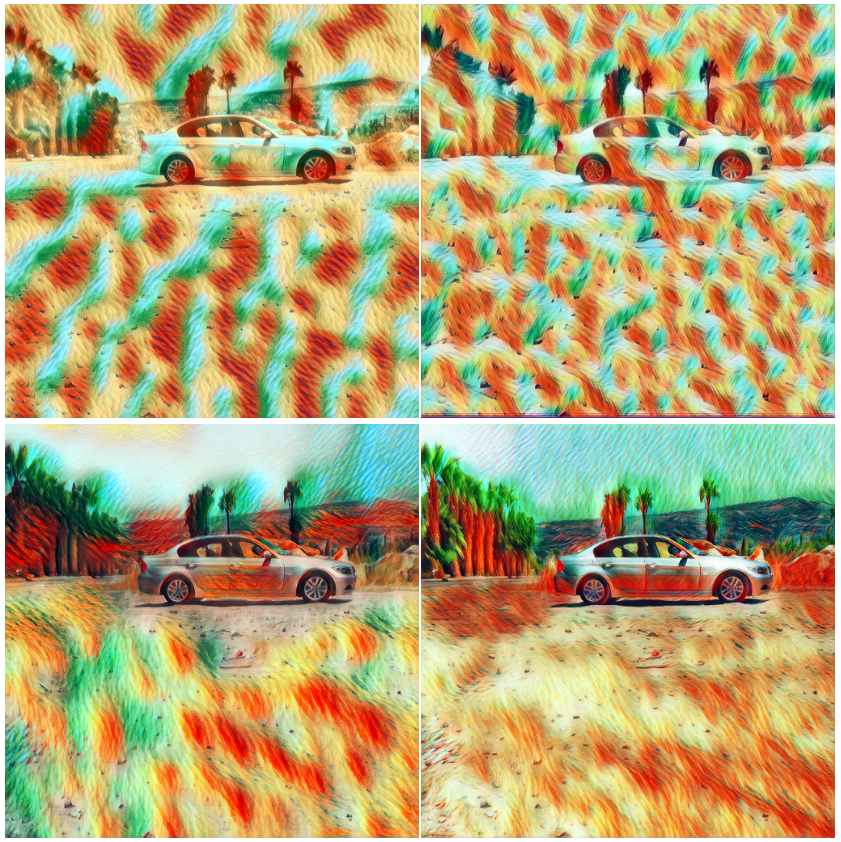 생성기 네트워크 g는 빠르지만, Ulyanov 등(2016)의 저자들은 학습에 너무 많은 예시 이미지를 사용하면 결과물이 오히려 저하된다는 점을 관찰하였다. 실제로 단 16장의 예시 이미지만 학습에 사용했을 때가 수천 장을 학습한 경우보다 더 나은 결과를 보였다. 가장 심각한 아티팩트는 매 합성곱 연산 전에 적용되는 제로 패딩(zero padding)으로 인해 이미지 경계(border) 부근에서 발생했다(그림 3 참고). 더 복잡한 패딩 기법을 사용해도 문제를 완전히 해결하기는 어려웠다. 결국 Ulyanov 등(2016)의 최고 성능 결과들은 소수의 학습 이미지만 사용하고, 학습을 일찍 종료(early stopping)함으로써 얻게 되었다. 우리는 이를 표준 신경망 아키텍처로는 학습 목표 자체가 너무 어려웠기 때문이라고 추정했다.