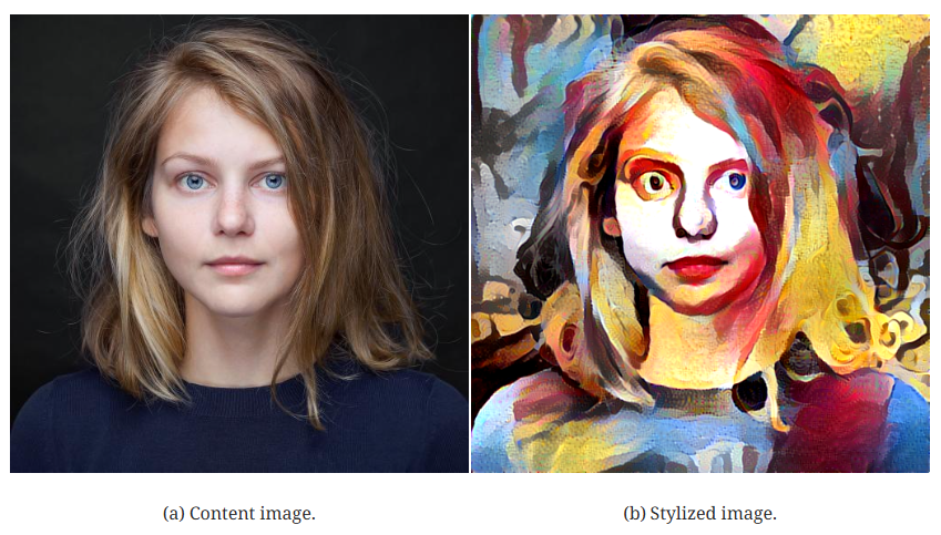 - 1행: 콘텐츠 이미지(왼쪽), 스타일 이미지(가운데), Gatys 등(2016) 방법으로 스타일 전이된 이미지(오른쪽).