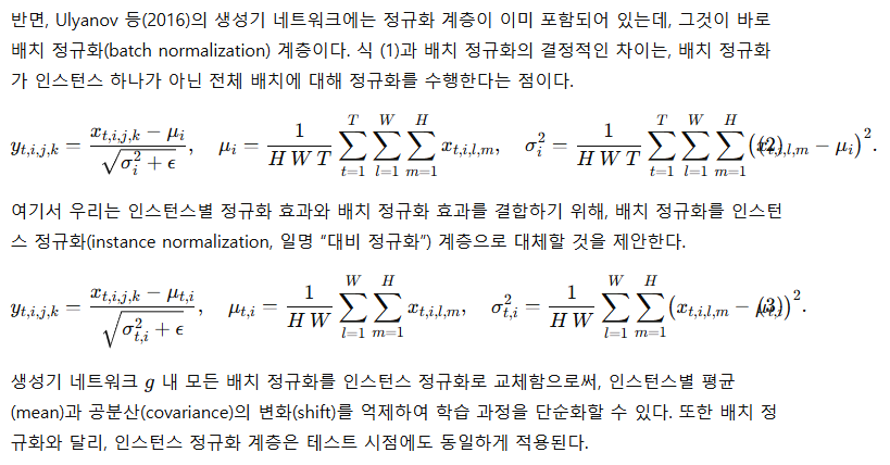 본 논문에서는 Ulyanov 등(2016)의 피드포워드 스타일화 방법을 재평가하고, 생성기 아키텍처에 작은 변화를 주는 것만으로 결과물이 크게 개선될 수 있음을 보인다. 실제로 이 변화로 인해 Gatys 등의 느린 최적화 방식과 견줄 만한 수준의 높은 품질을 확보하면서, 동시에 일반적인 GPU 환경에서 실시간 처리가 가능해진다. 핵심 아이디어(2장)는 생성기 아키텍처에서 배치 정규화(batch normalization) 계층을 인스턴스 정규화(instance normalization) 계층으로 교체하고, 이것을 테스트 시점에서도 유지하는 것이다(즉, 배치 정규화의 일반적인 “동결 및 단순화(freeze and simplify)” 처리 과정을 거치지 않는다). 직관적으로 이러한 정규화 과정은 콘텐츠 이미지의 인스턴스별 대비(contrast) 정보를 제거하여 이미지 생성을 단순화해 주고, 실제로 이러한 방식은 크게 향상된 결과물을 가져온다(3장).