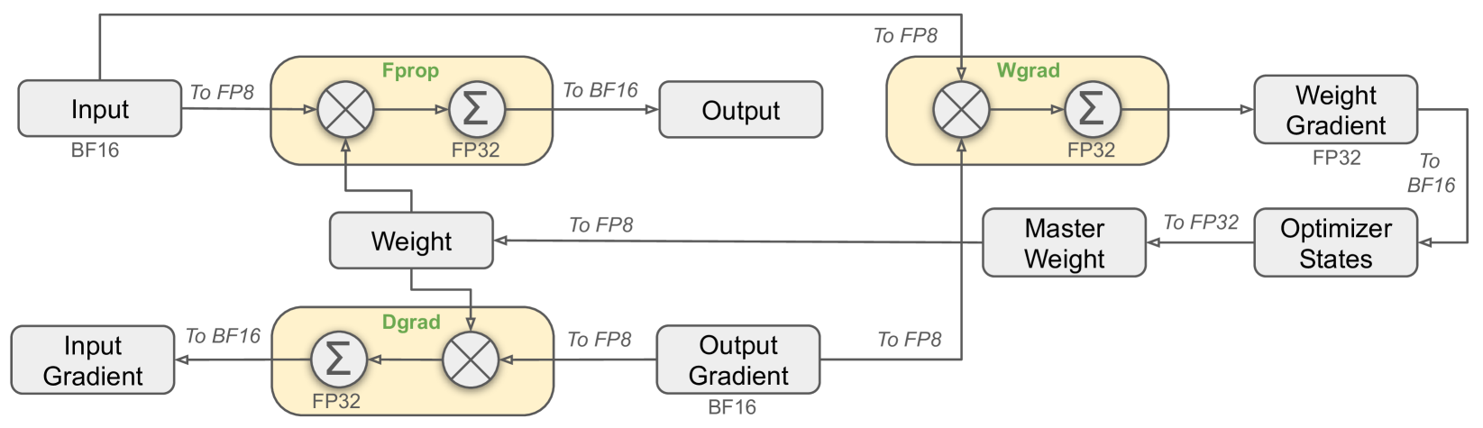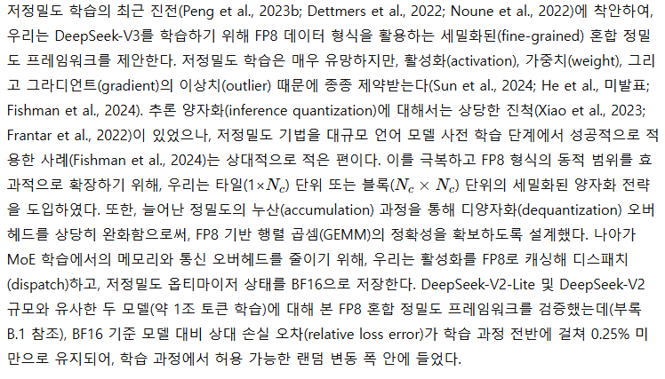 - FP8 혼합 정밀도 학습 프레임워크를 설계하고, 초대형 모델 규모에서 FP8 학습이 실제로 가능하고 효과적임을 처음으로 검증하였다.