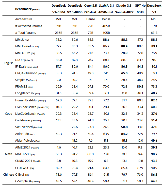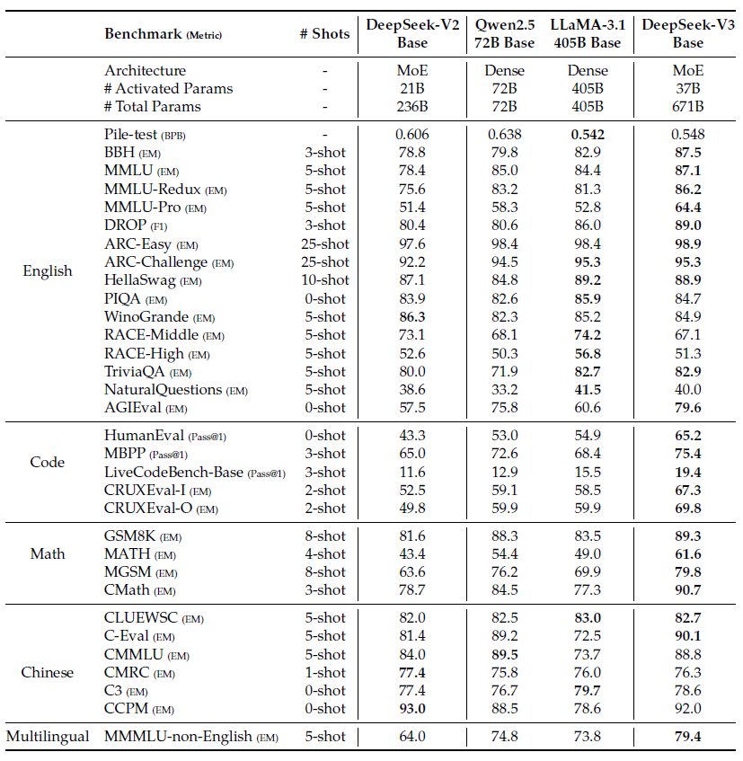 - C-Eval, CLUEWSC 등 중국어 교육 지식 평가에서는 DeepSeek-V3와 Qwen2.5-72B가 비슷한 수준을 보이며, 두 모델 모두 복잡한 중문 추론·교육 태스크에 최적화된 결과다.