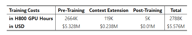 Table 1: DeepSeek-V3의 전체 학습 비용 추정. H800 GPU 대여 비용을 GPU 시간당 $2로 가정.