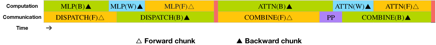 Figure 4: 개별 순방향(forward) 청크와 역방향(backward) 청크 쌍에 대한 겹치기 전략을 나타낸다. (트랜스포머 블록의 경계와 정렬되지 않음) 주황색은 순방향, 녹색은 “역방향 입력”, 파란색은 “역방향 가중치”, 보라색은 PP(pipeline parallelism) 통신, 빨간색은 배리어(Barriers)를 뜻한다. all-to-all 및 PP 통신 모두 완전히 감출(hide) 수 있다.